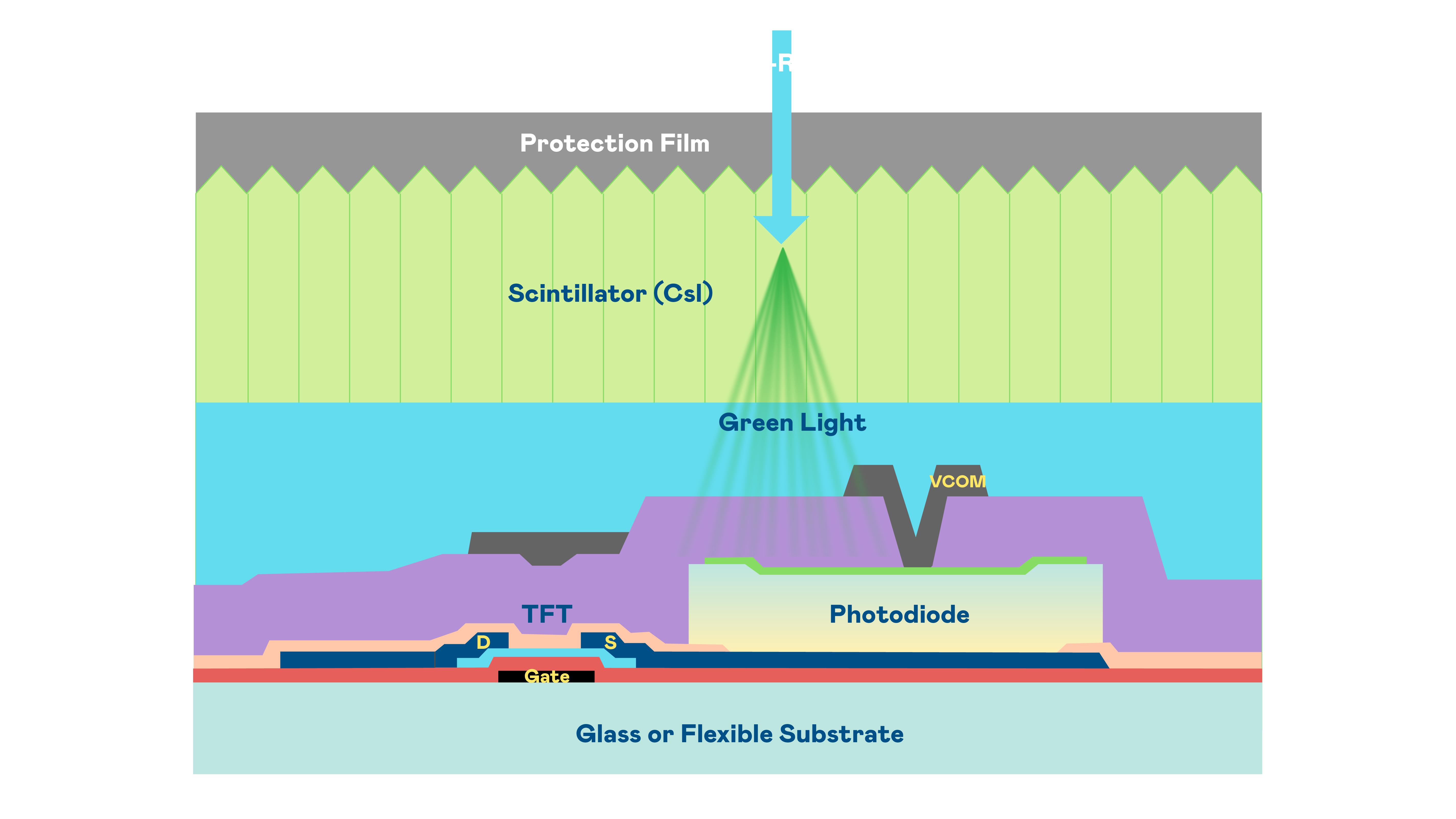 PG电子的X光影像感测阵列使用薄膜电晶体 (TFT) 作为每个像素的读取开关,搭配光电二极体(Photodiode)的光电转换元件,用以感测X光影像讯号。